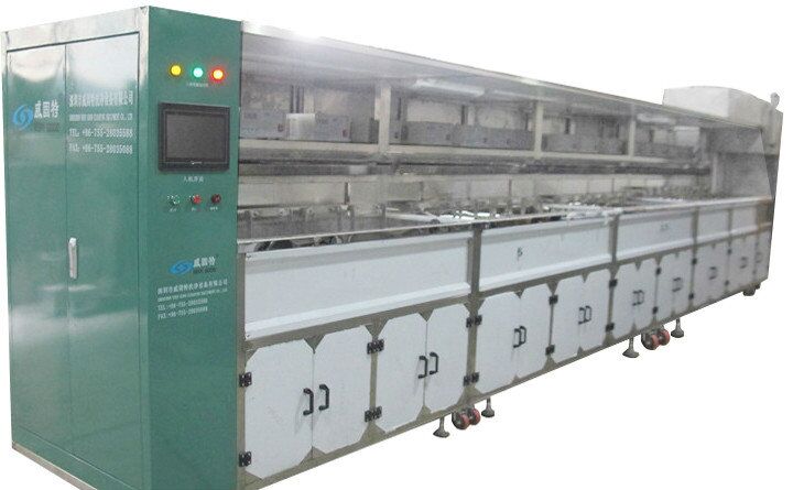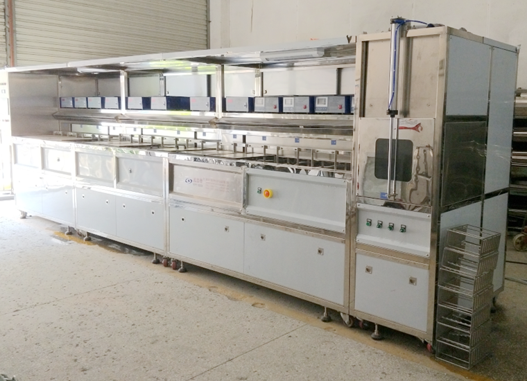 LED透鏡超聲波清洗機慢拉提升機構:為保證蒸汽浴洗的效果,保障均勻冷卻干燥的過程,在第17,18槽特設自動慢拉提升機構,工件經過蒸汽浴洗后,緩慢提升,通過冷凍區,快速干燥。