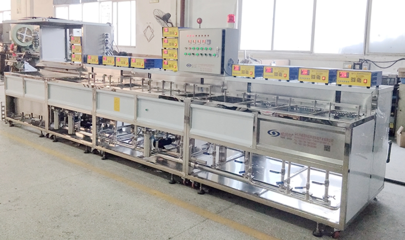 該清洗機主要由超聲波發生器、換能器、清洗槽、儲液槽、循環過濾系統、自動恒溫加熱系統、拋動系統、抽氣罩、冷水機、機架、電控柜等組成。
